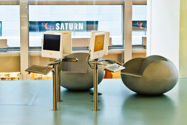 Take a seat in these concrete looking, but actually light and soft seats, while you listen to music online, on our Apple computers: